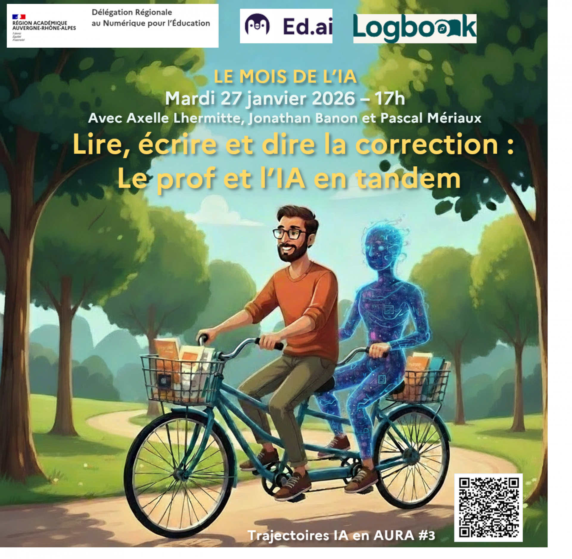 Ce webinaire, organisé dans le cadre du Mois de l’IA en académie et du cycle Trajectoires IA en AURA #3 « Lire, écrire et dire à l’ère des IA » de la DRANE AURA, propose d’explorer deux approches complémentaires de la correction assistée par IA. D’un côté, Ed.ai, un assistant qui analyse les productions écrites des élèves et génère des pistes de remédiation personnalisées. De l’autre, Logbook, qui permet à l’enseignant de commenter oralement les copies et de transformer sa parole en retours accessibles et incarnés.