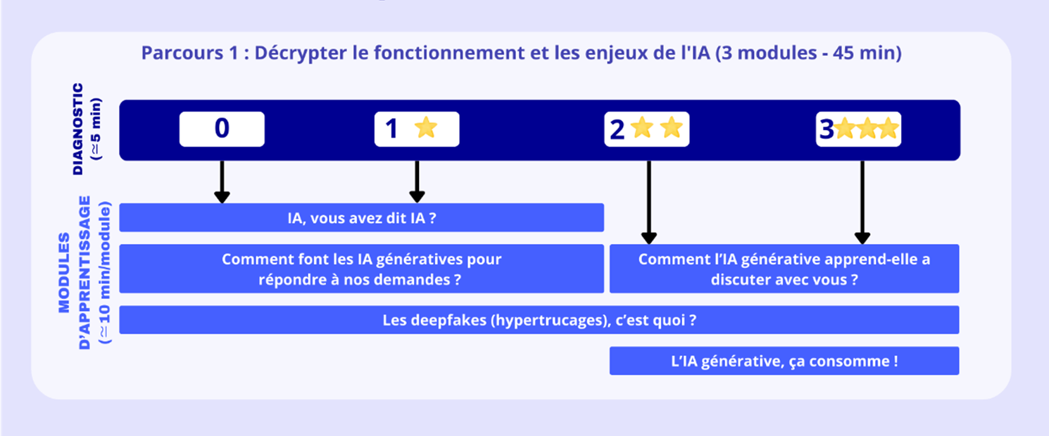 L'élève commence par un parcours diagnostic qui lui proposera ensuite différents modules d'apprentissage personnalisés (bases du prompting, fonctionnement des IA génératives, gestion des données, impacts environnementaux).