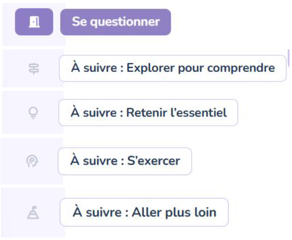 Les modules d’apprentissage reposent sur une pédagogie active et suivent un scénario en cinq étapes : se questionner, explorer pour comprendre, retenir l’essentiel, s’exercer et aller plus loin.
