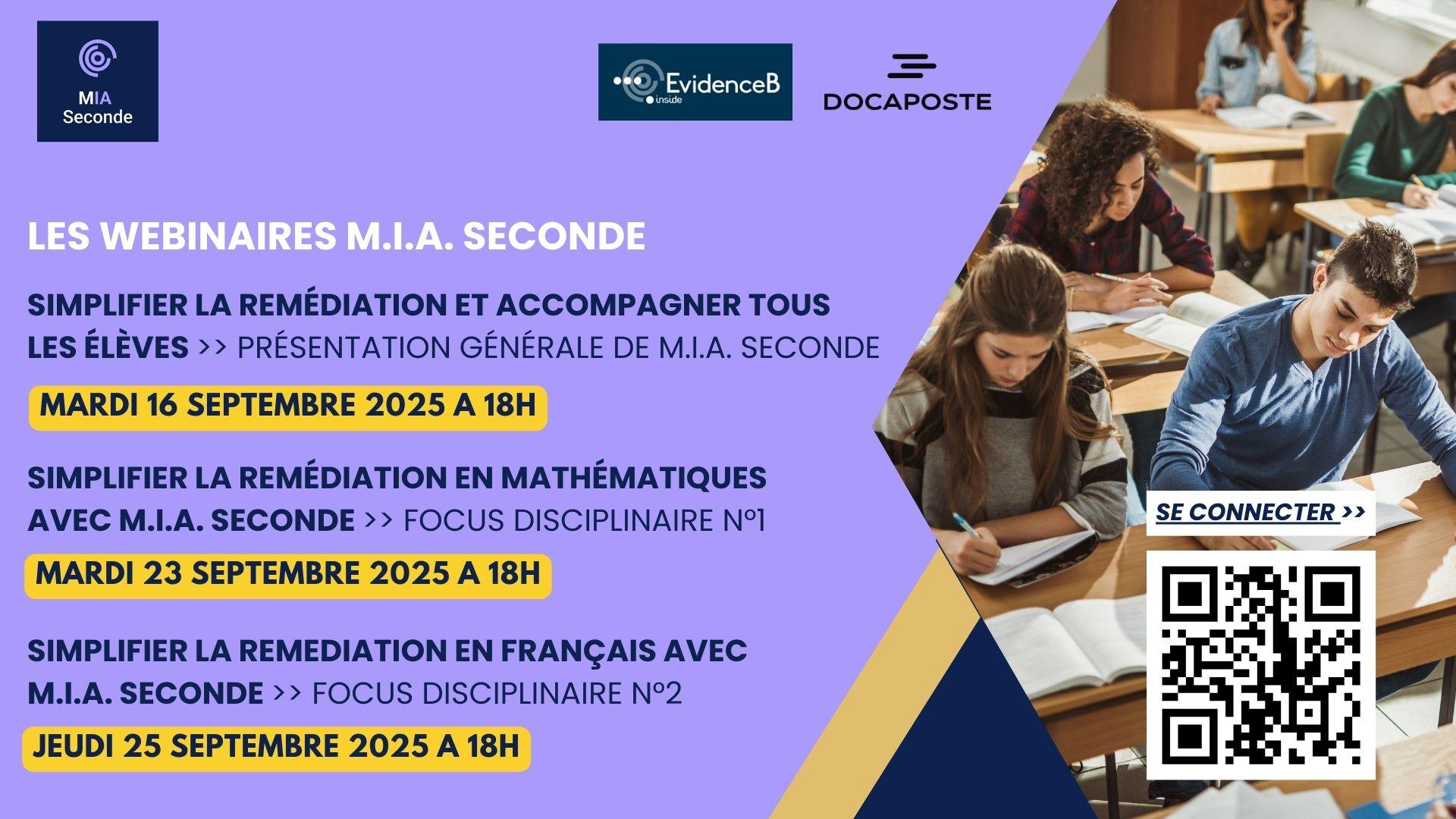 - Mardi 16 septembre, 18h – 18h45 : webinaire n°1 - présentation générale de la ressource M.I.A. Seconde (tous publics)