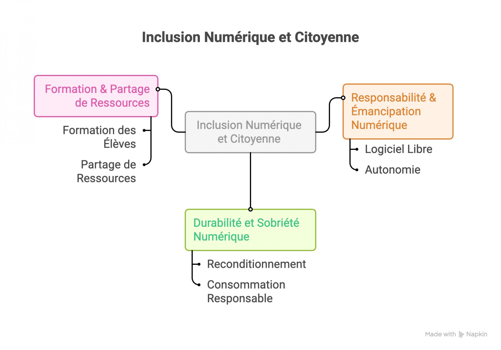 Le projet vise à rendre le numérique accessible à toutes et à tous, en s’attaquant à la fracture numérique. Cela passe par des actions concrètes : reconditionnement de machines, distribution d’ordinateurs équipés de logiciels libres aux élèves non-équipés, mais aussi aux écoles primaires. Il y a une logique de solidarité interne au lycée, portée par les élèves eux-mêmes : l’idée est que chaque élève puisse non seulement avoir accès au numérique, mais également participer, comprendre, contribuer, choisir — bref, être citoyen et acteur, pas simple utilisateur. - Responsabilité & émancipation numérique
